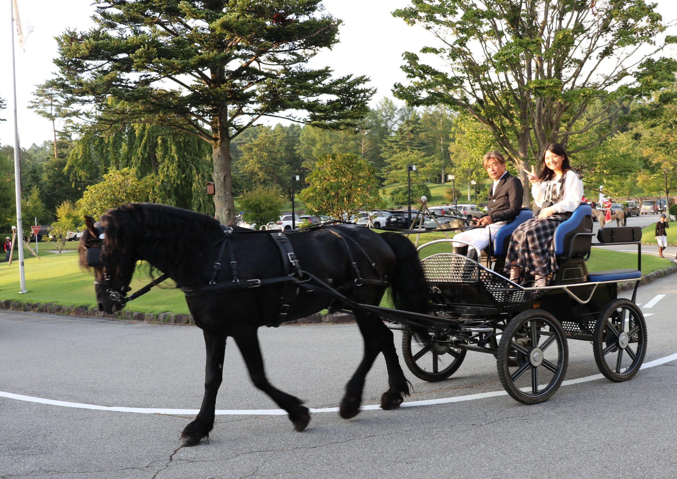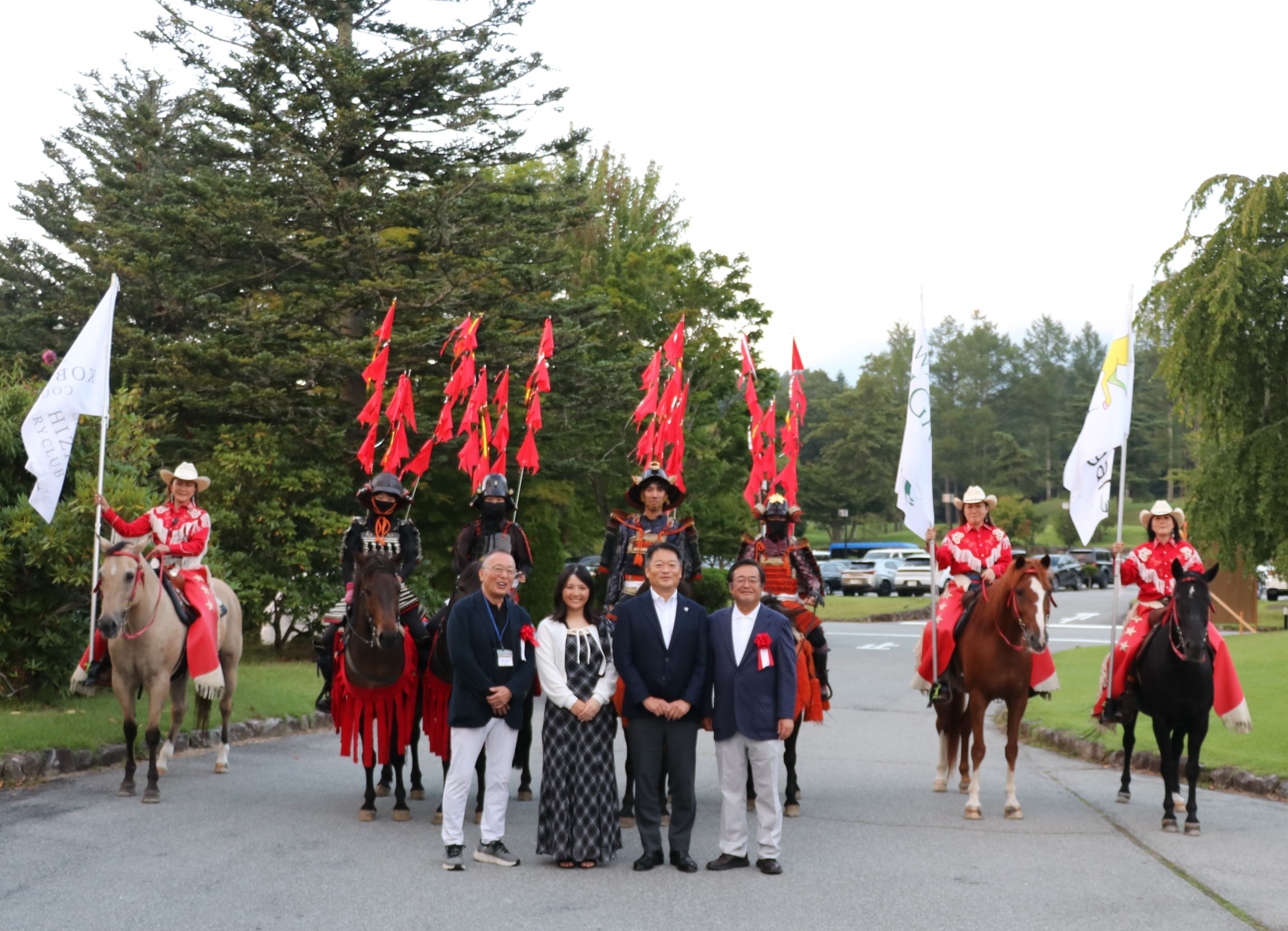 プレー終了後には『うまのまち小淵沢』を象徴する恒例の馬車による優勝セレモニーが行われました。今年はこれがバージョンアップ。甲斐の国やまなしならではの騎馬武者や伝令などの先触れがサポートし、賑やかに表彰式が始まりました。